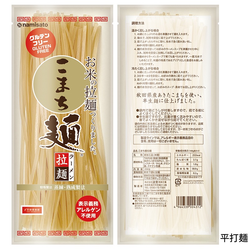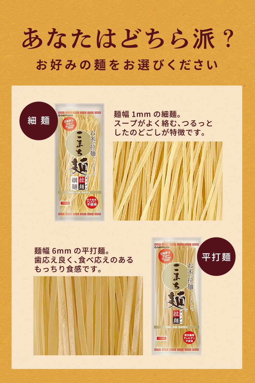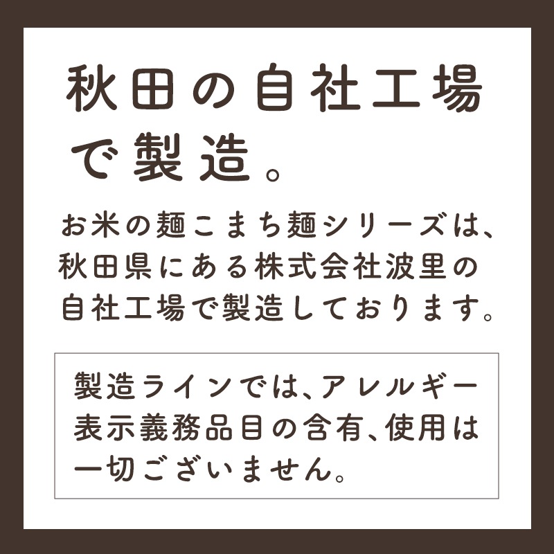 蒸練熟成製法により、日持ちが長くコシのしっかりしたこめ麺が完成しました。あきたこまちの持つ独特の粘りと甘味・旨味、そしてモチモチ感が特徴です。 【麺には、アレルゲン表示義務及び表示推奨品目の含有、使用は一切ございません】 1.お鍋にたっぷりのお湯を沸騰させて麺を入れます。 2.強火で2分を目安に、茹で上げて下さい。 3.茹で上がったらザルに取り冷水でよく水洗いをします。(こまち麺を美味しくお召し上がりいただくポイントです。) 4.よく水気を切って、お好みのラーメンスープでお召し上がり下さい。