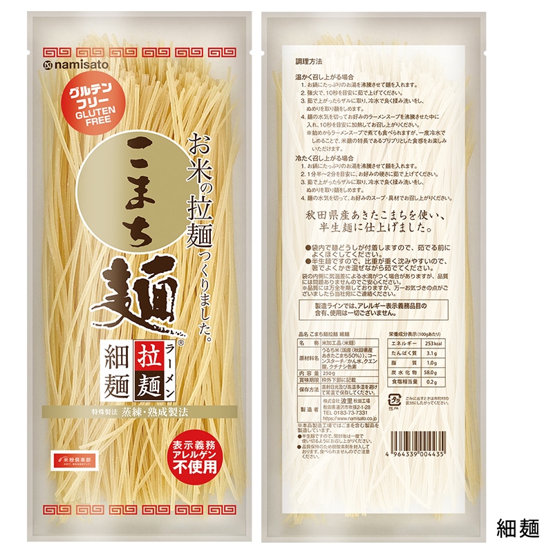 秋田県産のあきたこまちをはじめ、主原料となる米は全て国産米を使用。特定原材料7品目は不使用。お子様からご年配の方まで幅広くお召し上がり頂けます。もちろん小麦を一切使用しておりませんので、健康志向の方に注目されているグルテンフリーの麺です。