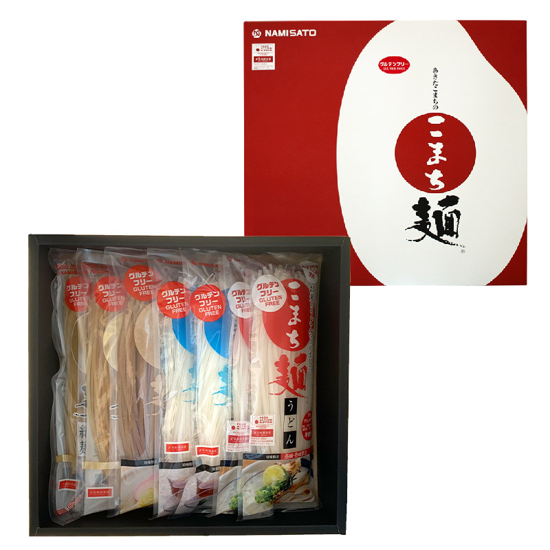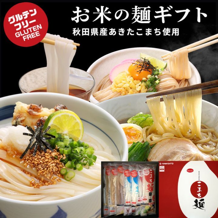 秋田県産あきたこまちを使った、もっちり食感の半生麺のお米の素麺です。7大アレルゲンと、小麦不使用のグルテンフリー麺でお子様からご年配の方まで家族皆様でお楽しみ頂けます。 蒸気を用いた蒸練製法の半生麺だから、ゆで時間たったの2分!素麺としてだけではなく様々な調理法でお楽しみ頂けます。