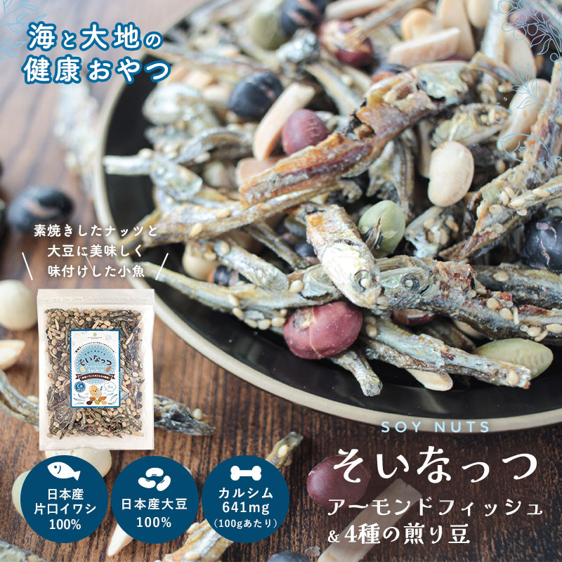 カルシウムたっぷりのアーモンドフィッシュに厳選した4種の国産大豆をミックス!素材のおいしさそのままに、栄養バランスのとれた健康的な一品です。あとをひく美味しさは、おやつにもおつまみにもぴったりです。 ・当店人気の国産4種の煎り豆ミックスに、アメリカ産のアーモンドとごま付の国産片口イワシをミックスしました。 ・カルシウムたっぷり!煎り大豆も入っているので、お子様の毎日のおやつにおすすめです。 ・ポリポリとした食感、甘じょっぱい味わいが、あとをひく美味しさ。おやつにもおつまみにもぴったりです。 ・国産いり大豆のなかでも紅大豆は国内の限られた地域でのみ収穫されている希少な大豆です。 ・安心の国内工場で厳重な品質管理のもと加工された製品をお届けします。