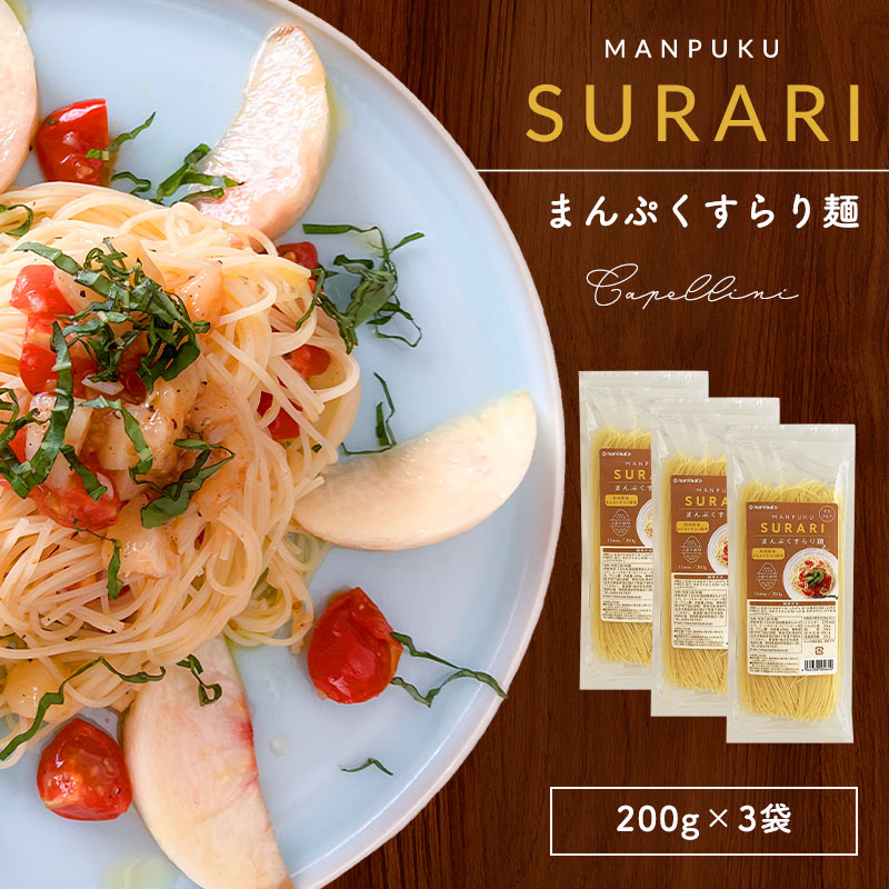 秋田県立大学で開発されたジャポニカ米由来の高レジスタントスターチ米「まんぷくすらり」を原料にしたお米のパスタ麺(カッペリーニ)です。 高レジスタントスターチ米「まんぷくすらり」とは? 秋田県立大学などで開発されたジャポニカ系高レジスタントスターチ米です。レジスタントスターチ(難消化性デンプン)を多く含む米(高RS米)。通常のお米と比べると粘りや柔らかさが少ないパラパラとした独特の食感をもつお米です。 レジスタントスターチ*を通常米の10倍もつまんぷくすらりを使った米粉パスタは、美味しくたべて健やかな毎日を送りたいあなたにおすすめです。麺のタイプは細麺(カッペリーニ)だから、ゆで時間も短縮。季節の野菜や果物を使った冷たいソースやシンプルなオイル系ソースなどがおすすめです。 美味しさと健康を追及した新感覚のお米のパスタを是非お試しください。 ※レジスタントスターチとは、消化しにくく食物繊維に似た機能性を持つ澱粉で難消化性澱粉ともよばれます。小腸で吸収されにくいため、血糖値の上昇を抑える作用や腸内環境を改善する作用があるといわれています。 ▼こんな方におススメ ・健康的なダイエットを目指している ・腸活に興味がある ・ついつい食べ過ぎてしまう ・食物繊維が不足気味だ ▼まんぷくすらり麺のお召し上がり方 1.麺の約10倍の程度の水を沸騰させます。 2.お好みで水1?に対して10g程度の塩を入れます。(麺には塩分が含まれておりません) 3.麺を表示時間どおりに茹でます。 4.冷たい流水で洗い、表面のぬめりを取り麺をしめます。 4.予め作っておいた冷たいソースと絡めて出来上がり。※温かいソースでもお召し上がりいただけます。