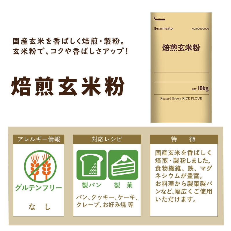 原料に国産玄米を100%使用。自社工場にて香ばしく焙煎したあとに細かく製粉加工しています。通常のお料理・パン・お菓子作りにプラスするだけで、香ばしい風味と、豊かなコクが生まれます。 10kgの業務用サイズです。