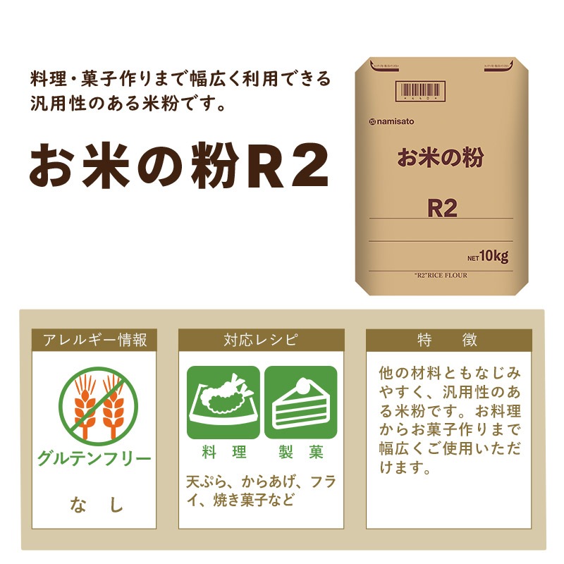 【製品特徴】 粒度:普通 吸水:やや多い 国産契約栽培米使用。Rよりもやや粗目に仕上げた米粉です。料理・菓子作りまで幅広くご利用いただけます。 10kgの業務用サイズです。の業務用サイズです。
