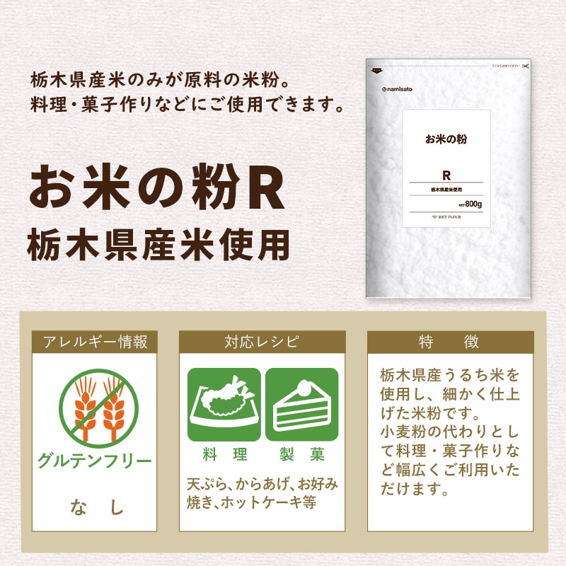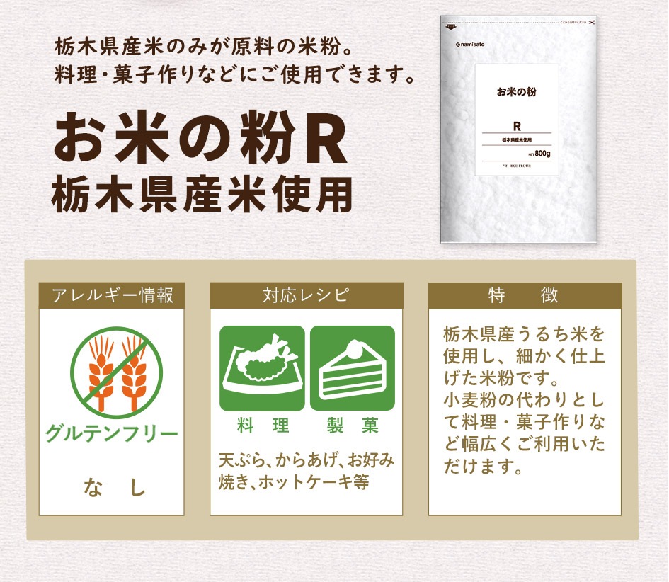 【製品特徴】 粒度:荒い(サクッとした食感) 吸水:多い(しっとりとした食感) 栃木県産うるち米を使用し、細かく仕上げた米粉です。小麦粉の代わりとして料理・菓子作りなど幅広くご利用いただけます。800gの業務用サイズです。