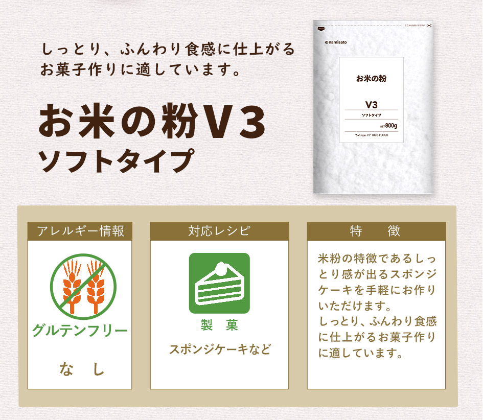 【製品特徴】 粒度:細かい 吸水:普通 米粉の特徴であるしっとり感が出るスポンジケーキを手軽にお作りいただけます。しっとり、ふんわり食感に仕上がるお菓子作りに適しています。