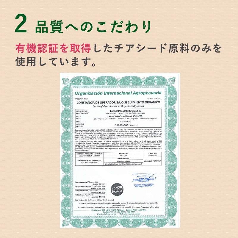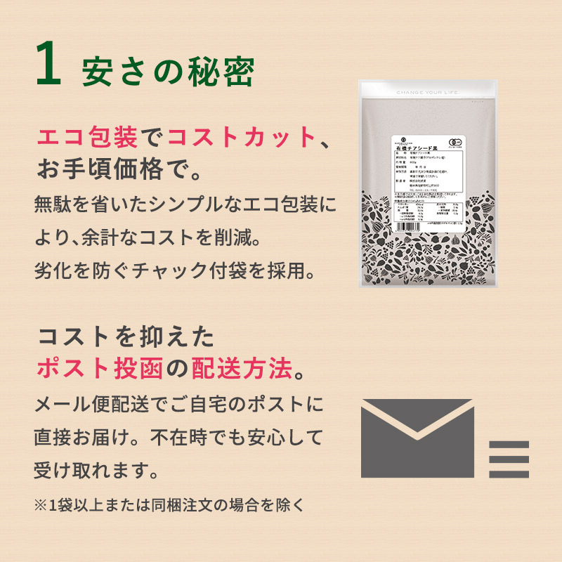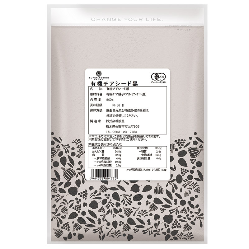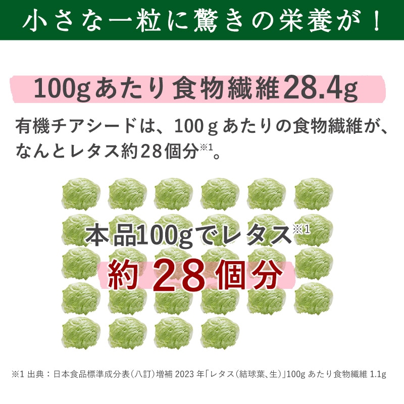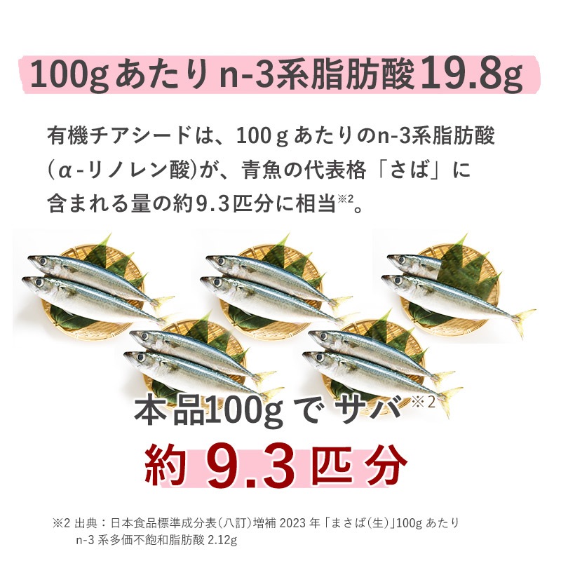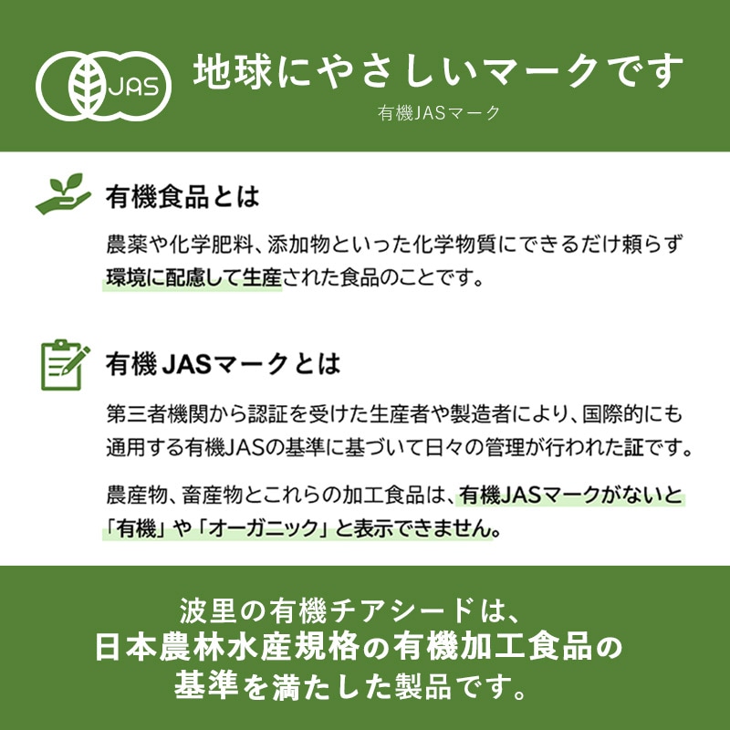 小さな一粒に驚きの栄養が!植物性で安心しながら健康に欠かせない食物繊維や必須脂肪酸を補給できます。 なみさとねっとの有機ブラックチアシードは100gあたり食物繊維28.4g、n-3系脂肪酸19.8g、n-6系脂肪酸5.9gが含まれています。有機認証を取得したアルゼンチン産のチアシードを、安心の有機認証取得の国内自社工場で製品化しています。 水に浸すと10倍以上に膨らむ不思議な種です。有効成分を突出して多く含むため、『スーパーフード』とも称されています。体内で作ることが不可能な必須脂肪酸オメガ3(αリノレン酸)、オメガ6(リノール酸)が含まれ、さらにミネラルや鉄、豊富な食物繊維といった不足しがちな栄養成分が多数含まれております。