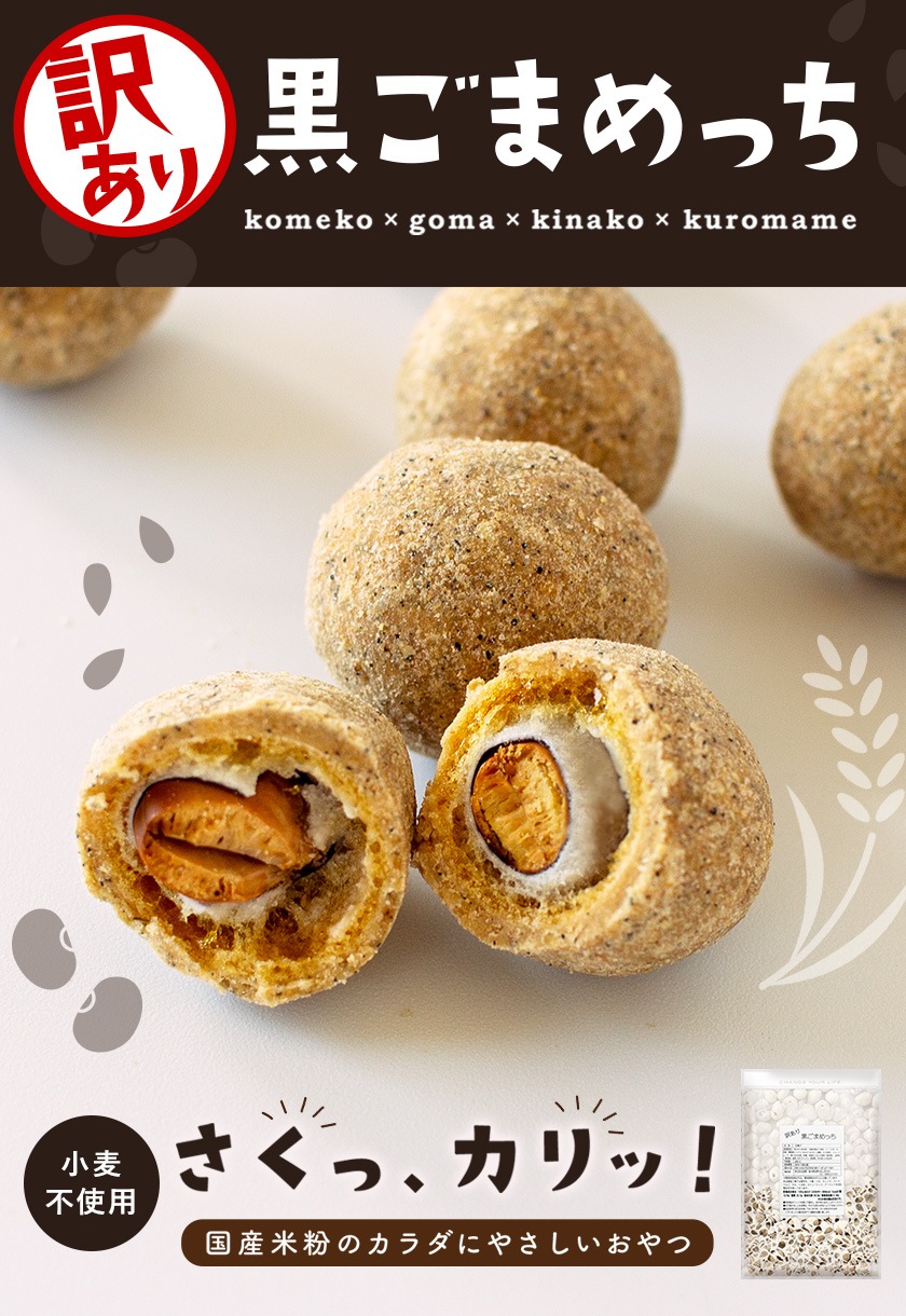 訳ありですが美味しさそのまま!さくっ、カリッ!小麦粉不使用、国産米粉、国産黒大豆、国産黒豆きな粉を使用したカラダにやさしいおやつ。 ・製造工程上で割れや欠けなど、成形が不ぞろいのものをたっぷり容量でご提供。もちろん、味や品質は通常の販売品と変わりがございませんので、安心してお召し上がりいただけます。 ・サクサク食感の国産米粉生地に、カリッと香ばしい黒豆の風味、黒すりごまをミックスした、黒豆きな粉のしっとりとした甘みのおやつです。 ・小麦粉なし、おいしくヘルシーに!こだわりの製法のもと試行錯誤を重ねて、小麦粉不使用の軽い食感を実現。当店なみさとねっとの専用米粉を使用しております。 ・カリッと頬張ると、中に大きな黒煎り大豆!大豆はタンパク質や食物繊維が豊富な食材で、特に黒大豆にはアントシアニンなどのポリフェノールが含まれています。 ・国産黒豆きなこには、黒すりごまで食感と風味にアクセントをプラス。黒豆きなこと黒ごまにはミネラルや食物繊維など毎日しっかり摂りたい栄養が豊富です。 ※検品後に発送をしておりますが、製品特性上割れやすいため配達などで割れてしまう場合がございます。 ※夏場はきな粉部分が溶けやすいため、冷蔵庫で冷やしてからお召し上がりください。